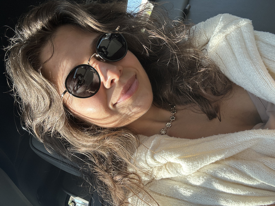 A female subject is depicted in a close-up, slightly upward-angled portrait photograph taken inside a vehicle in the city of Dubai, United Arab Emirates. The subject has long, wavy brown hair, wears dark, round sunglasses with thin gold-colored frames, and exhibits a subtle, closed-mouth smile. She is dressed in an off-white, ribbed knit cardigan over a light-colored undershirt, and a silver-toned necklace featuring small floral-shaped pendants is visible around her neck. Direct sunlight illuminates the left side of her face and hair, creating distinct highlights and shadows. Reflections in the sunglasses show the interior of the vehicle and indistinct elements of the exterior environment. A dark upholstered headrest or seatback is visible in the background.