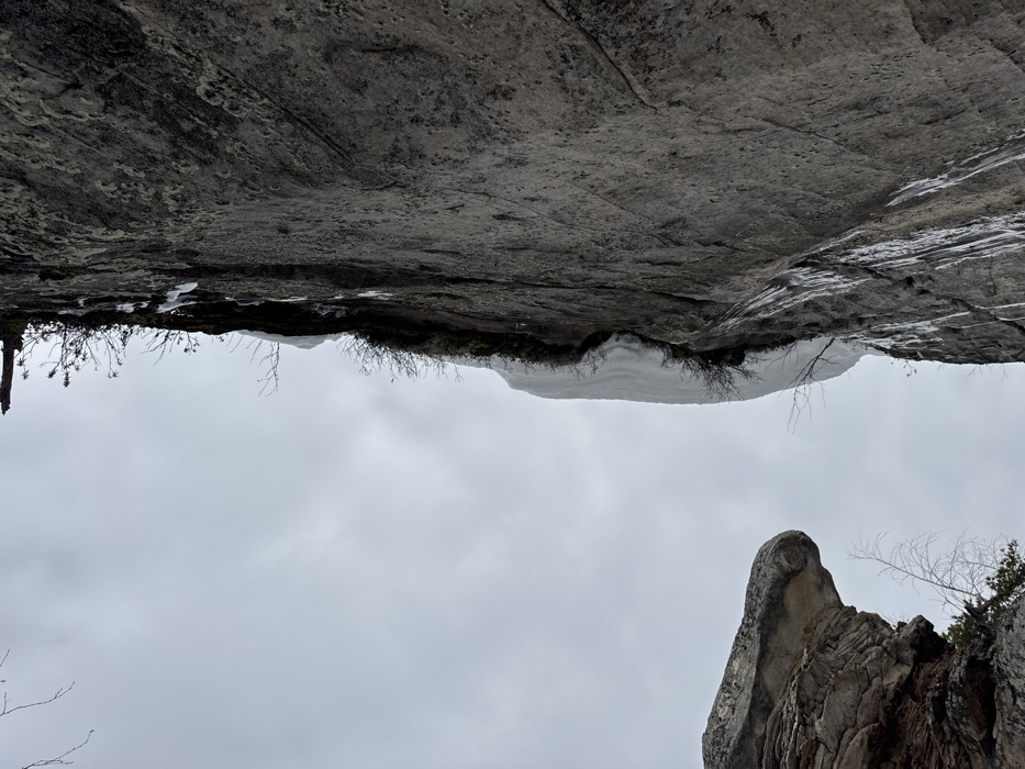 The image depicts a natural, rugged landscape, specifically within the city of Shumikhinskii, Russia, under an overcast sky. The viewpoint is a low-angle perspective, looking upwards at prominent rock formations. On the right side, a substantial, dark grey, vertical rock face dominates the frame, displaying textured surfaces, cracks, and patches of lichen. Along its upper edge, a thick accumulation of white snow or ice is present, exhibiting an undulating profile. Below this snow line, numerous vertical streaks of melting ice or water are visible on the rock face, indicating active thawing. Sparse, dark, leafless branches of small vegetation protrude from crevices along the rock face, particularly near the snow and ice. To the left, a distinct, lighter grey rock formation is partially visible, characterized by a rounded, overhanging cap that resembles a mushroom or hoodoo. Its surface shows layered texture. A few slender, bare tree branches are discernible beneath and to the right of this formation. The sky, occupying a significant portion of the upper-left and central frame, is a uniform, light grey, indicating an overcast condition. No human subjects, animals, or artificial structures are present in the scene. The overall environment appears cold and natural, indicative of a wintry or early spring season.