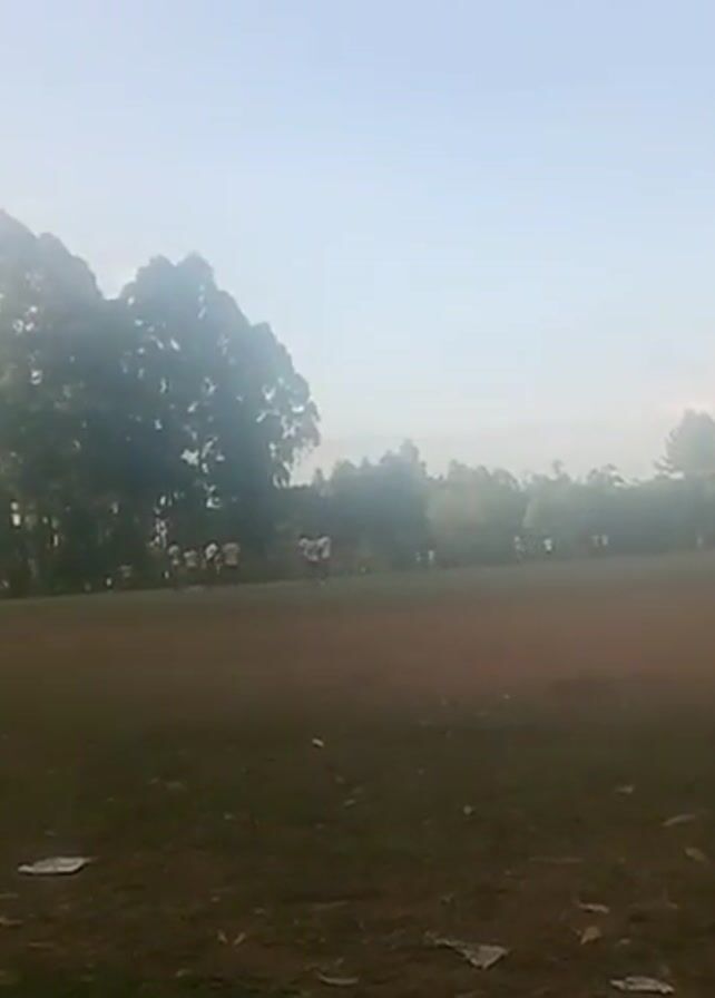 large, grassy field surrounded by trees, possibly a park or athletic field. In the distance, a group of people wearing white shirts appears to be walking or running along the edge of the field. The sky is overcast or hazy. At the start of the video, a finger briefly obscures the view. Towards the end of the video, the sound of a baby crying is heard.