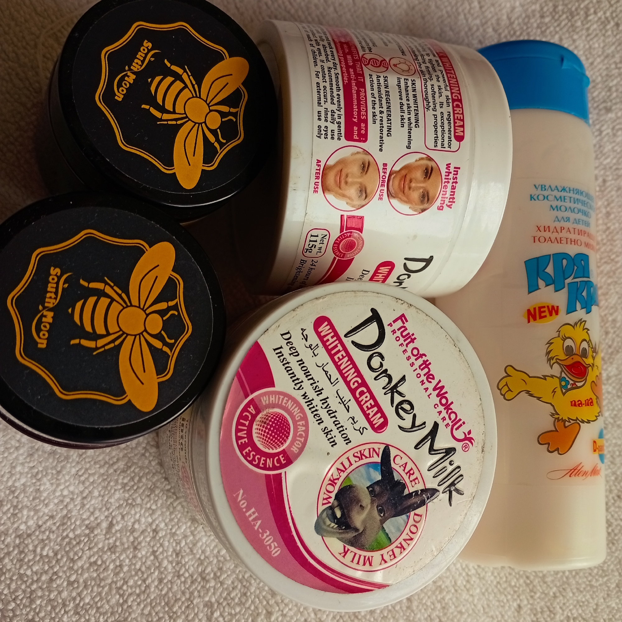 Four cosmetic product containers are displayed on a white, textured fabric surface in Harmanli, Bulgaria. In the top-left and bottom-left, two black, cylindrical jars are visible, each with a gold lid featuring a gold honeybee emblem and the text "South Moon." Centrally, a large white cylindrical jar with a pink and white label is prominent. This jar is branded "Fruit of the Wokali Professional Care Donkey Milk Whitening Cream," showcasing a donkey's head image. The label text includes "WHITENING CREAM," "Deep nourish, hydration," "Instantly whiten skin," "ACTIVE ESSENCE," and "No. HA-3050," along with "BEFORE USE" and "AFTER USE" facial images illustrating skin whitening effects. Benefits like "SKIN WHITENING" and "SKIN REGENERATING" are also listed. To the right, a tall, slender white plastic bottle with a blue flip-top cap features a label with a yellow cartoon duck. Prominent blue Cyrillic text reads "КРЯ КРЯ" (Krya Krya) and "NEW," while smaller Cyrillic text identifies it as "УВЛАЖНЯВАЩО КОСМЕТИЧНО МОЛОЧКО ЗА ДЕТЕ" (Moisturizing Cosmetic Milk for Children) and "ХИДРАТИРАЩО ТОАЛЕТНО МЛЯКО" (Hydrating Toilet Milk). All items are stationary, arranged in a slightly overlapping configuration on the fabric surface.