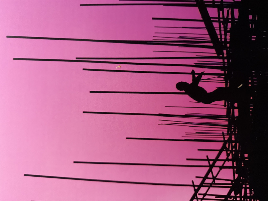 A silhouetted person dives from a bamboo scaffolding structure against a pink sky