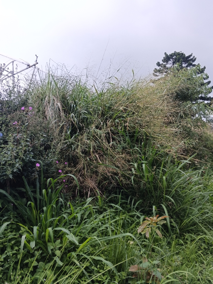This image depicts an outdoor scene in Koipa, Papua New Guinea, under an overcast sky. The scene is dominated by dense, overgrown vegetation, primarily consisting of tall green grasses with broad leaves. Numerous grass stalks throughout the midground exhibit light brown seed heads. Several small clusters of magenta-colored flowers are visible on leafy plants, concentrated on the left side of the frame. A dark green coniferous tree is partially visible in the upper right quadrant. In the upper left, a light-colored, skeletal structure, appearing to be an antenna mast or utility support constructed from poles and crossbeams, protrudes above the foliage. No human subjects or animals are present. The lighting is diffuse and even.
