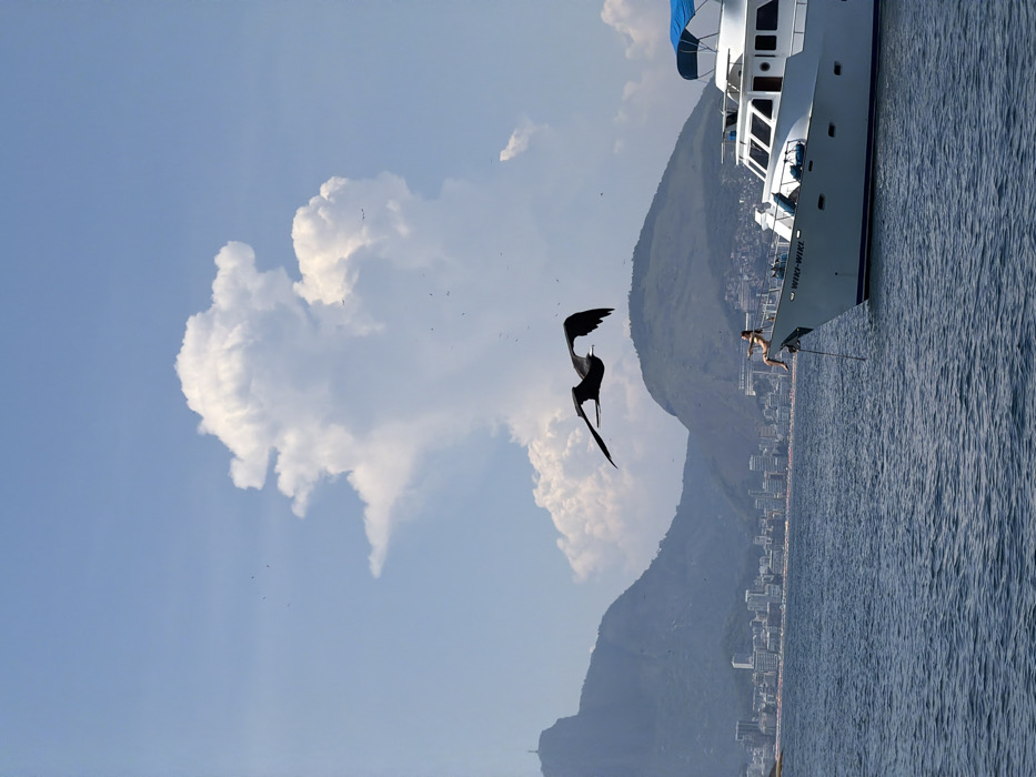 A vertical shot shows a dark frigatebird in flight against a backdrop of blue sky and fluffy clouds. To the right, a yacht cuts through blue water, a person poised on its bow. A coastal city stretches along the base of a mountain range in the distance, with a prominent peak resembling Christ the Redeemer.