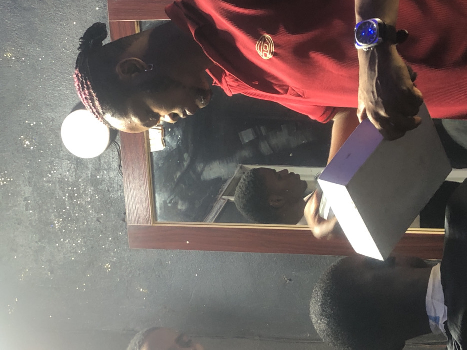 A man with braided hair is captured in front of a mirror. He wears a red polo shirt and a blue watch. He's holding a rectangular box. Reflected in the mirror is his image along with another person being attended to, partially visible at the bottom. The setting appears to be a salon or grooming area with a light bulb illuminating the scene and a speckled wall in the background.