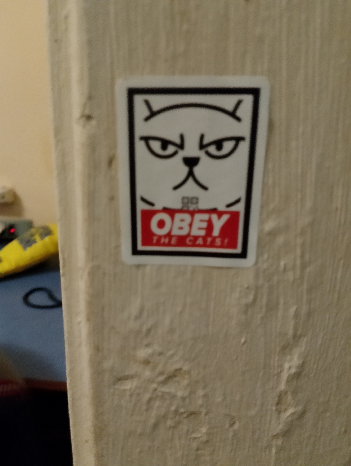 A rectangular sticker is affixed to a textured, light-colored vertical surface in an indoor environment in Yarun, Ukraine. The sticker displays a stylized white cat's head with a black outline, featuring a displeased expression characterized by narrowed eyes and a furrowed brow. Below the cat's head, a red banner contains the word "OBEY" in large white capital letters, with "THE CATS!" in smaller white capital letters beneath it. The vertical surface exhibits minor surface imperfections and an uneven texture. The background, out of focus, reveals a pale yellow wall or corner to the upper left. In the lower-left background, a blurry blue surface is visible, supporting a dark coiled object and an indistinct yellow object. A faint red indicator light is also discernible in the lower-left portion of the frame.