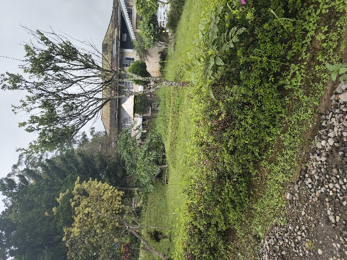 The image depicts an outdoor scene in An Khe Ward, Vietnam, on an overcast day. In the foreground, a gravel surface composed of various sized grey and black stones runs across the bottom of the frame. Immediately above the gravel is a low, dense green hedge, approximately 0.5 to 1 meter in height, exhibiting small purple flowers in scattered clusters. Below the hedge, smaller green herbaceous plants grow from the soil. The midground features a sloped grassy lawn extending upwards towards a large building. Several trees and shrubs are distributed across this lawn. A prominent, tall, deciduous-looking tree with a visible trunk and branches, showing sparse green foliage at its upper sections, stands centrally in the mid-right. To its left, a smaller tree with lighter green or yellowish foliage is visible. Various other green shrubs and smaller trees are interspersed throughout the grassy area. A small, white structure with a conical roof, resembling a gazebo or canopy, is situated in the midground behind the central tree. In the background, a large, multi-story building with a dark, weathered roof dominates the upper half of the scene. The building's facade is light-colored, possibly beige or cream, with multiple windows featuring white frames. Dense green foliage, likely from tall trees, forms a backdrop behind and to the left of the building, indicating a heavily vegetated area. No individuals or active subjects are present in the frame.