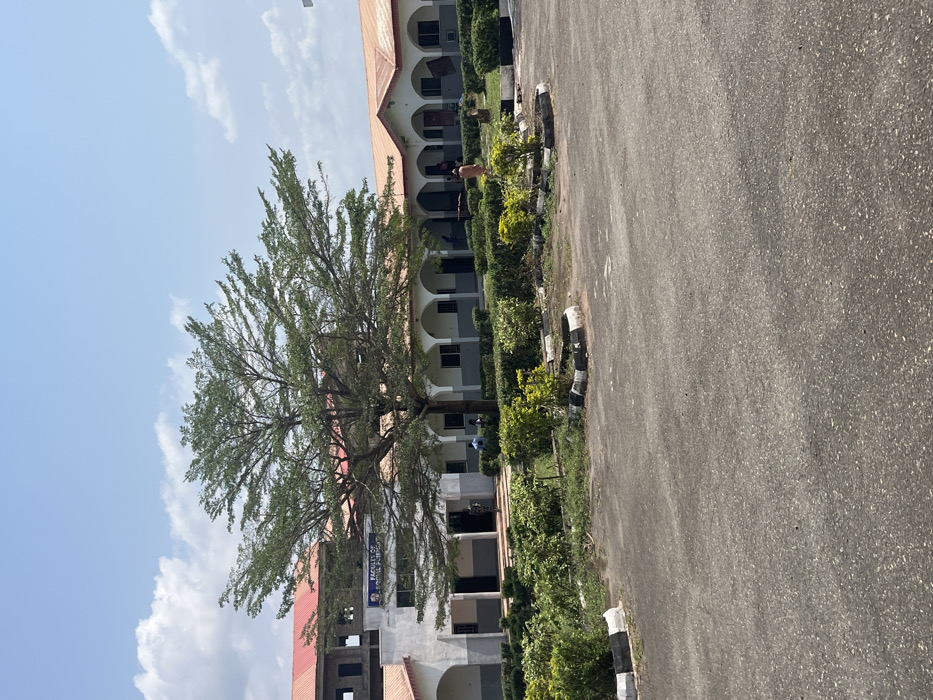 This image depicts an exterior view of an academic campus, specifically the Faculty of Social Sciences, as identified by prominent signage on the primary building. This facility is located in Osu, Nigeria. The central structure is a light-colored building with a red-orange sloped roof, featuring a series of arched porticoes along its front facade. To the left, a multi-story building under construction is partially visible, characterized by exposed concrete structural elements and a similar red-orange roof. A large, deciduous tree with dense green foliage stands in the middle foreground, partially obscuring the main building. Between the paved foreground and the buildings, landscaped areas contain manicured hedges and small plants, bordered by low curbs painted black and white. The immediate foreground is a grey asphalt surface, indicating a parking or pedestrian area. Several individuals are present: one person in light-colored clothing is walking towards the right side of the main building, another person in dark attire stands near the central entrance, and additional indistinct figures are visible beneath the building's arched walkways. The scene is illuminated by bright daylight, with a blue sky sparsely dotted with white cumulus clouds.