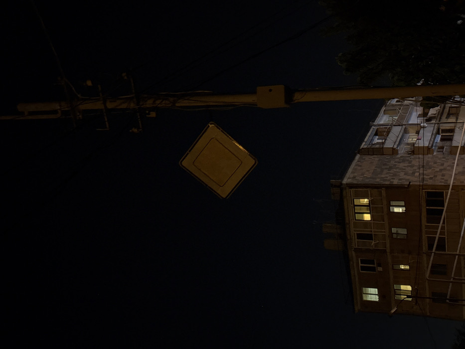 The image displays a nighttime urban scene in Armavir, Armenia. A dark, unlit sky dominates the upper portion of the frame. A yellow square-shaped road sign, featuring a white border and an inner yellow square, is visible in the upper center-right, oriented diagonally approximately 45 degrees counter-clockwise. A tall, light-colored utility pole occupies the right side of the frame, extending from the lower-right to the top edge. This pole supports multiple cross arms and an intricate network of dark electrical cables and wires; a rectangular utility box is attached to its lower section. In the background, to the left of the utility pole, is a multi-story residential building with a weathered facade, displaying balconies and window frames. Several windows on the building's upper floors are illuminated with warm yellow light. Dark, indistinct foliage is visible along the far right edge of the frame. No individuals, vehicles, or discernible actions are present in the scene.
