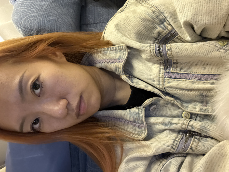 A fair-skinned young woman with auburn hair and dark eyes looks at the camera. She has a gentle expression and wears a black top under a light blue acid-wash denim jacket with lavender detailing. Part of the jacket features white fur. The background is a mix of blue and denim. The photo is taken from an overhead angle, creating a casual, intimate feel.