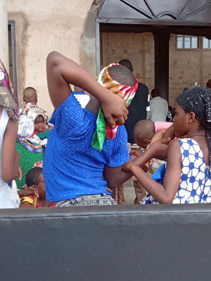 A group of individuals, predominantly women and children, are depicted in an outdoor or semi-outdoor setting within the city of Onitsha, Nigeria. The foreground is partially obscured by a dark, padded surface, possibly the top of a vehicle seat or bench. In the immediate foreground, a young woman or older child is seen from the back-right, wearing a blue textured top with white polka dots and grey-black patterned shorts. Her dark hair is short, and a vibrant multi-colored headwrap (featuring red, green, white, and yellow stripes) covers her head. Her right arm is raised, bent at the elbow, appearing to adjust the headwrap or hold an unseen object above her head. To her right, another young woman or older child is visible from the back-left, her dark hair covered by a black, possibly sequined, head covering. She wears a white dress with a repeating blue geometric pattern and cradles a baby dressed in pink clothing against her left shoulder. Behind these figures, several children are present. One child in green attire with a patterned head covering looks towards the viewer. Another child with a yellow and red garment is visible near the bottom-center, positioned beneath the blue-clad figure, possibly eating. The background features a building structure. A large, dark metal doorway or archway with a radial or fanned design at the top serves as a focal point, revealing a deeper section of the building. A dark pillar stands within this opening. Beyond the pillar, a wall with multiple-paned windows is visible. The exterior walls of the building are light-colored, likely stucco or concrete, and display signs of age or wear. Several adults, including a man in a black textured shirt and another in a light-colored shirt, are partially visible in the mid-to-background, mostly seen from behind. The ground beneath the individuals appears to be a light, possibly concrete or dirt surface. The scene captures a bustling communal area during daylight hours.