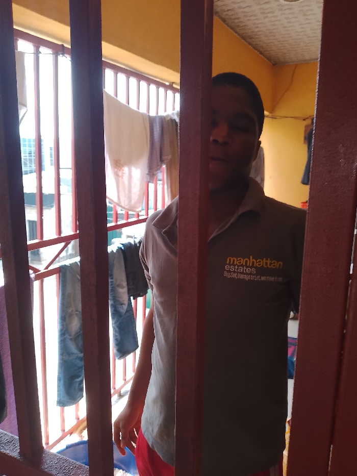 A person wearing a gray shirt with "manhattan estates" printed in gold stands behind a red metal barred gate. Hanging clothes are visible in the background. The person's face is partially obscured by the bars. The scene is captured indoors with a yellowish-orange wall and ceiling in the background. The lighting is bright, casting shadows on the person and the gate.