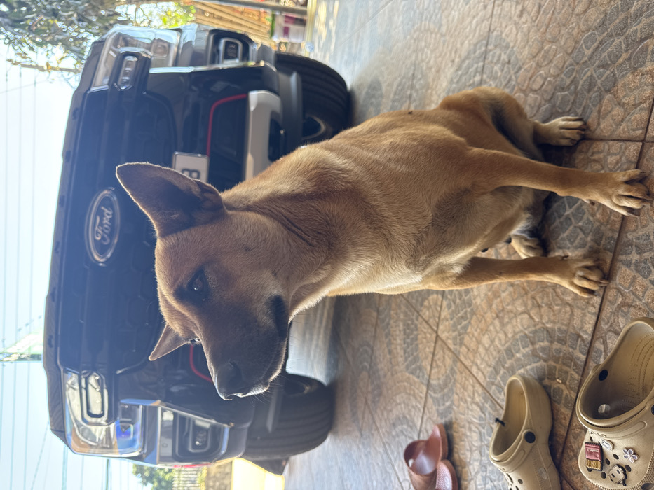 A tan dog lies on a tiled surface near a black Ford truck. The dog is positioned with its head close to the truck's front end, facing the camera. To the right of the dog, there are two pairs of shoes: a set of brown sandals and a pair of light tan Crocs. The background includes a glimpse of foliage and a structure, possibly a house or garage. The scene is well-lit, suggesting an outdoor setting.