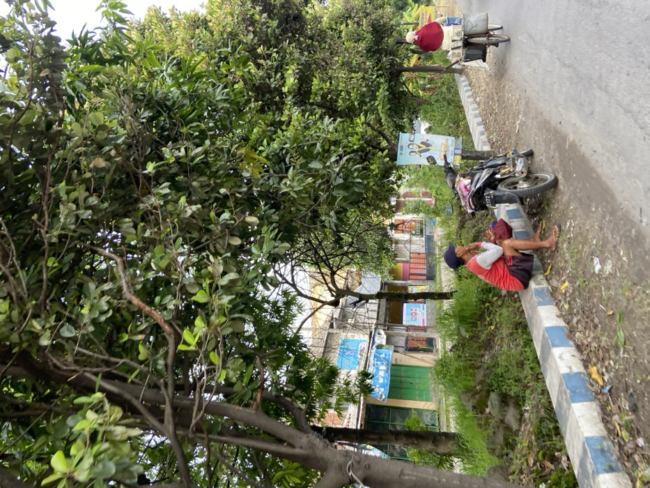 A man in a red shirt and dark shorts sits on a curb beside a parked motorcycle. He wears a blue cap and appears to be eating or drinking. Behind him are buildings with colorful doors and windows. Trees with dense green foliage fill the foreground and background. A man with a cart is walking on the road.