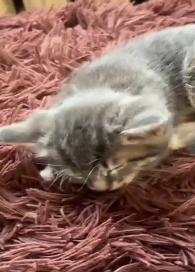 small, gray tabby kitten lying on a shag rug. The kitten appears to be trying to sleep, with its head resting on its paws. The rug is a deep rose color. The lighting is soft and warm. A piece of dark furniture is partially visible in the background.