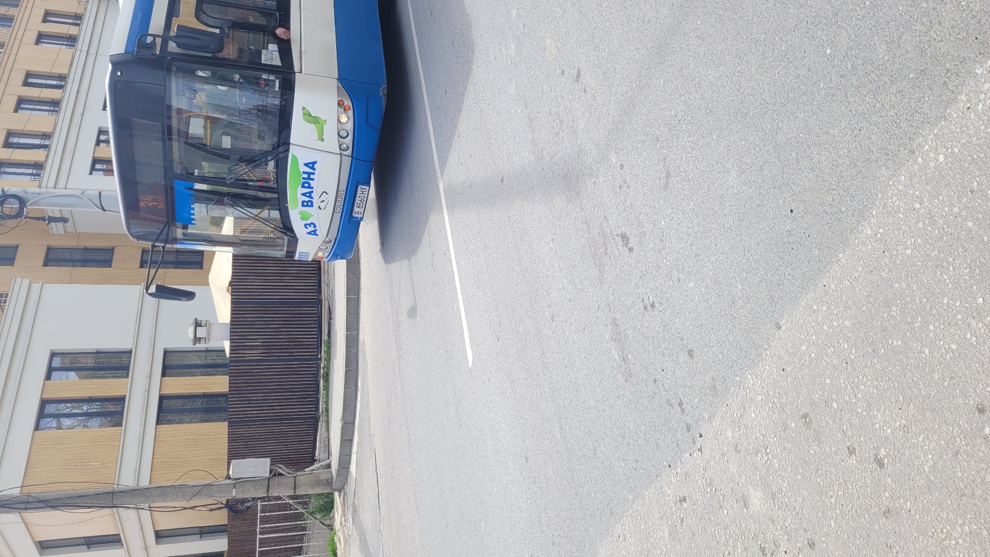 blue and white city bus, marked "A3 VAPHA," parked on a gray asphalt road. The license plate number visible is "B 8560 HX." A building with light yellow and white walls and dark-framed windows stands adjacent to the bus. A utility pole with wires is visible in the foreground. The location is in Varna, Bulgaria, based on the bus markings.