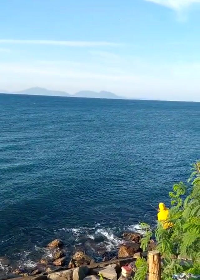 coastal scene on a sunny day. The camera initially focuses on a man fishing by the rocky shoreline before panning upwards and to the left, revealing a cafe with wooden tables and chairs set up overlooking the ocean. Several people are sitting at the tables, enjoying drinks and the view. In the distance, there are hills or islands visible across the water. The sky is clear blue with some scattered clouds. The water is a deep blue and has gentle waves. The vegetation is lush and green.