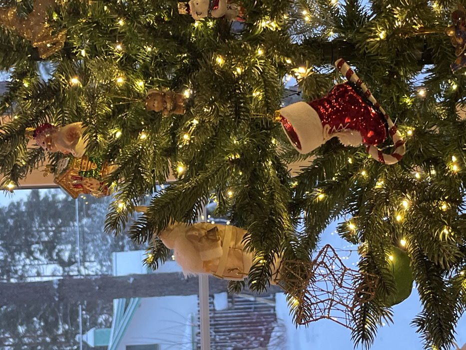 The image depicts an indoor scene in Finskiy Briz, Russia, featuring a decorated Christmas tree in the foreground with a snowy outdoor landscape visible through a window in the background