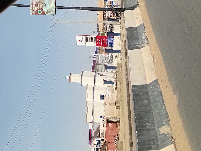 This image depicts a street-level scene in Sharada, Nigeria, under a clear sky. In the foreground, a multi-segment concrete road barrier, painted in alternating grey and white sections, separates the viewer from the background. Beyond the barrier, a paved road surface is visible. In the midground, from left to right: a weathered red shipping container structure stands behind the barrier. Adjacent to it, a white building, identifiable as a mosque by its integrated minaret topped with a green dome, features blue-tinted windows and dark blue accent doors. To the right of the mosque, a petrol station operates under red canopies, indicated by a tall, red and white vertical sign displaying "Ardova Plc" branding and multiple fuel prices. Further right, a black utility pole supports overhead power lines and features a billboard poster with a smiling male political figure in traditional attire. Distant buildings are partially visible in the far background. No individuals are clearly discernible or engaged in specific actions.