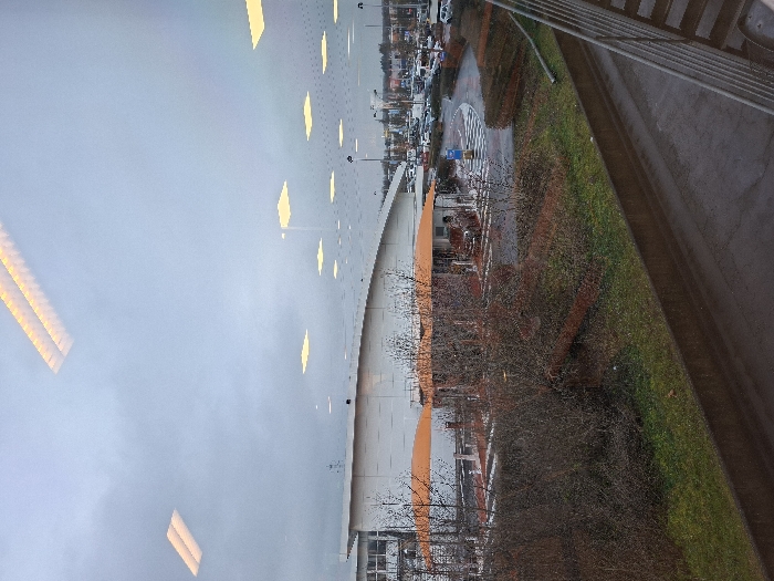 The image depicts an exterior view of a commercial complex in Foetz, Luxembourg, observed through a window that reflects interior lighting fixtures. The sky is uniformly overcast. In the foreground, a metal stair railing is visible on the lower right. A concrete retaining wall runs horizontally, separating a wet, paved asphalt surface from a narrow grassy embankment. This embankment features dormant, leafless deciduous shrubs and small trees. In the midground, a single-story commercial building with a white, gently sloping roof and white exterior walls is present. Directly in front of this building, an outdoor dining area is covered by multiple large, orange-tan rectangular awnings. This area contains tables and seating. Adjacent to this structure, a wet asphalt roadway forms a small roundabout with white chevron markings. More bare trees and sparse vegetation are scattered throughout this area. The background consists of an extensive parking lot populated by numerous parked passenger vehicles of various colors. Multiple streetlights are visible across the parking area. Distant commercial buildings and the upper portions of trees are discernible beneath the cloudy sky. No individuals or specific actions are identifiable within the scene. The overall environment suggests damp conditions, with wet surfaces and dormant vegetation.