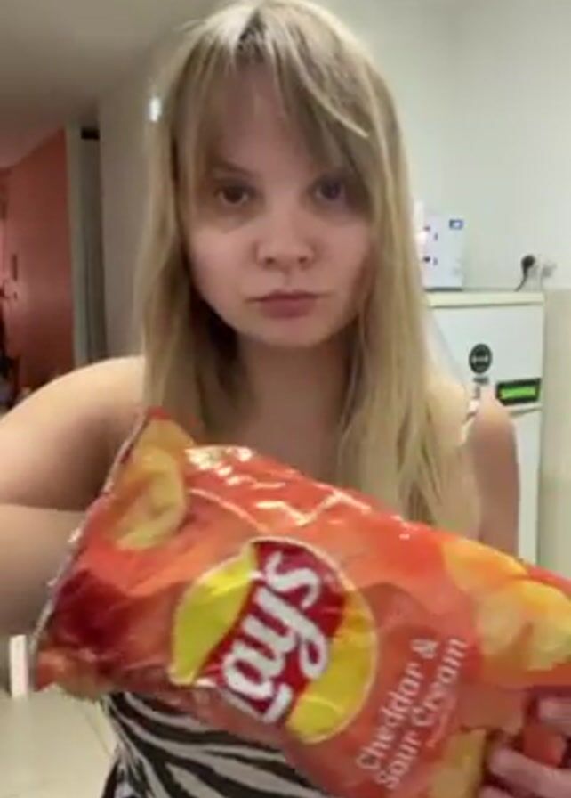 A young woman with blonde hair and bangs, wearing a zebra-striped dress, stands in what appears to be a kitchen area. She holds up a bag of Lay's Cheddar & Sour Cream chips, then takes a chip and eats it. Next, she holds a bottle of Coca-Cola Zero in her other hand. The background shows a refrigerator and other kitchen items. The lighting is typical of an indoor residential space.