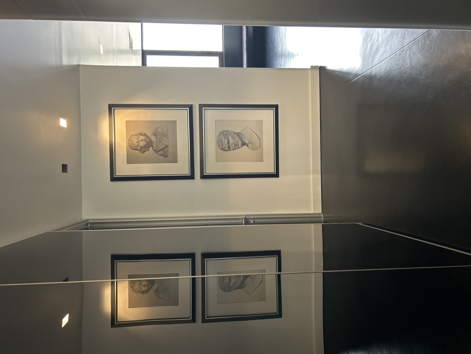This image depicts an interior view of a modern hallway or corridor in Lisbon, Portugal. A large, full-height mirror on the left wall reflects two framed artworks and a section of the dark floor. The reflections show a portrait of a young individual with short hair and a classical male bust positioned below. On the opposite right wall, two framed pieces of art are displayed vertically. The upper frame contains a monochrome drawing of a young person's head and shoulders, depicted in a classical style with short, wavy hair. The lower frame features a monochrome drawing of a classical male bust, facing to the viewer's right. Both artworks are rendered in greyscale or sepia tones and are housed in black frames with white matting. The ceiling is white and features recessed square and rectangular light fixtures. The floor is a dark, highly reflective surface, possibly polished concrete or epoxy, which reflects ambient light and portions of the walls. At the far end of the hallway, an opening reveals an adjacent room with large windows, allowing bright natural light. A dark, low bench is visible beneath these windows. No individuals or active interactions are present in the scene.