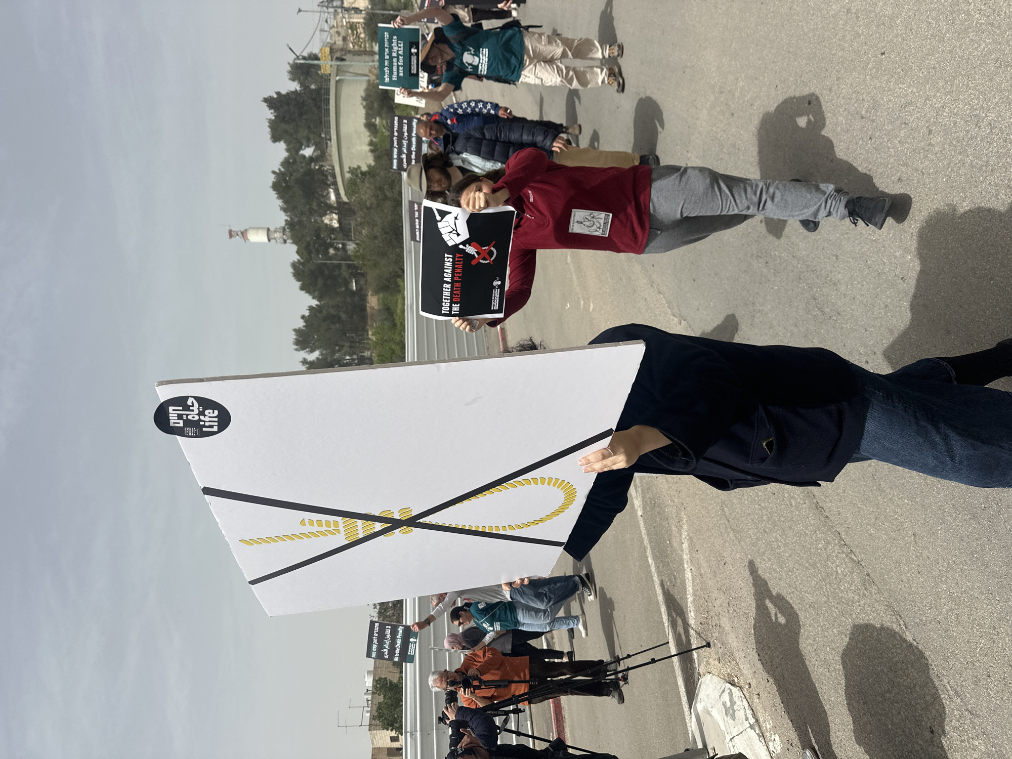 A street-level, eye-level shot captures a group of individuals protesting against the death penalty. They are lined up on a paved road, holding signs in English, Hebrew, and Arabic that convey messages such as "Together Against The Death Penalty," "No to the Death Penalty," and "Human Rights are for ALL!" One sign prominently displays a noose, a visual symbol opposing capital punishment. The group appears to be of diverse ages and backgrounds. Behind them, a mix of urban and natural elements can be seen, including buildings, trees, and a communications tower. The photograph was taken during the day, with a clear sky overhead. Shadows on the ground indicate the position of the sun. The location is the city of a-Doha, Palestinian Territory.