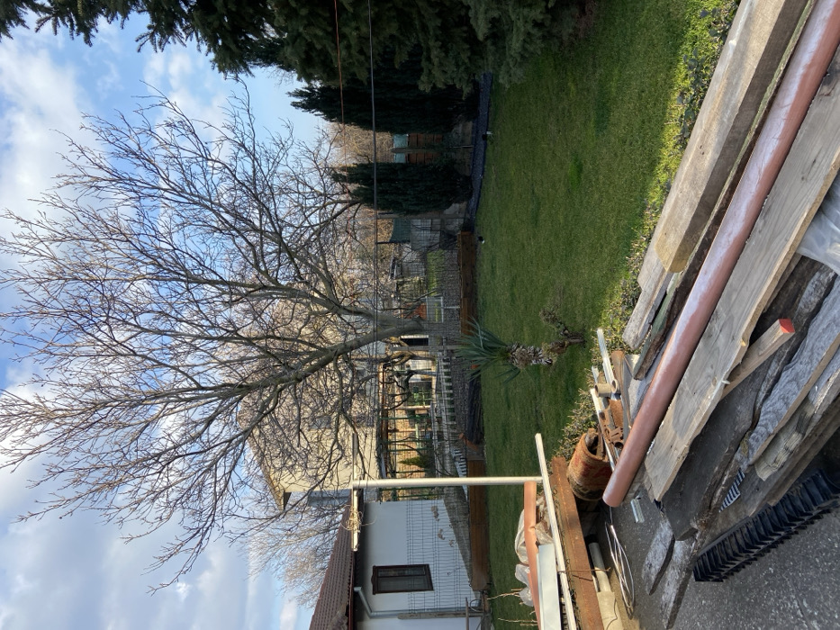 This image depicts a residential backyard scene in Topoli, Bulgaria, under a clear sky with scattered white clouds. In the immediate foreground, a pile of assorted construction materials, including weathered wooden planks, a reddish-brown pipe, and various metal scraps, rests on a concrete surface. To the left, a single-story white building with a brown-tiled roof and a dark-framed window is partially visible, fronted by a low metal fence. A tall, light-colored metal pole stands between this building and the center of the frame. The midground features a prominent, large deciduous tree with bare, intricate branches, indicating a leafless state. Below this tree, a small palm-like plant grows on a neatly maintained green lawn that occupies the majority of the midground and extends towards the right. Along the back perimeter of the garden, a row of dark green, slender evergreen trees (likely cypress) stands in front of a fence, with a larger, broader evergreen tree partially visible on the far right. In the background, behind the large deciduous tree, a two-story light-colored building is visible. No individuals are present in the scene, and no discernible actions or interactions are occurring.