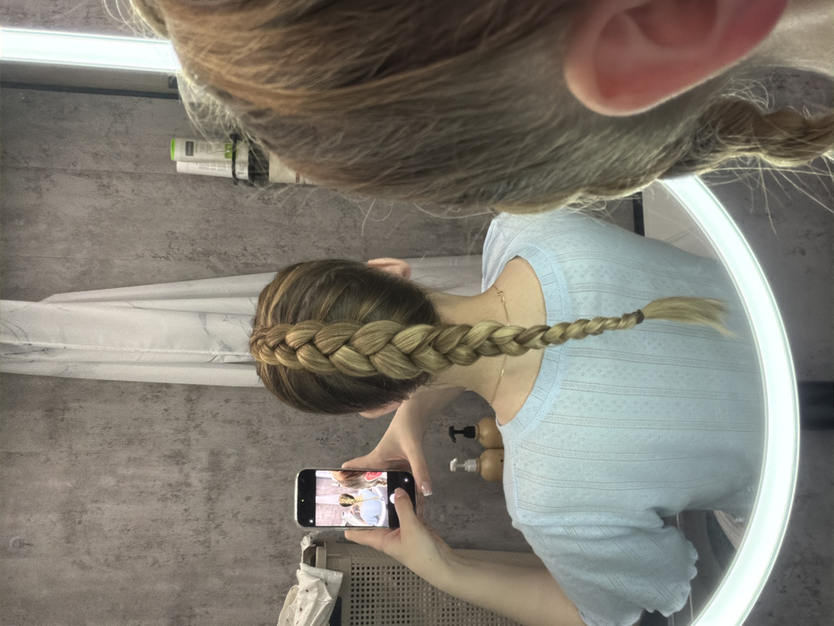 The scene, set within a bathroom in Reshetnikovo, Russia, shows a person viewed from behind, reflected in a large circular mirror with an integrated light rim. The individual possesses light brown hair with blonde highlights, styled into a thick, centrally placed French braid that extends down their back and is secured with a dark elastic band near its end. They are wearing a light blue, short-sleeved top with a subtle, textured pattern and a thin, gold-colored necklace. The person's right hand holds a light-colored smartphone, pointing its camera toward the mirror to capture their reflection. The smartphone's screen prominently displays a live view or captured image of the braided hair, creating a recursive reflection effect. In the reflected background, to the left, a light-colored woven laundry hamper containing white fabric is visible against a textured gray wall. To the right, a white fabric shower curtain is partially seen. On a shelf or ledge behind the person's left shoulder, two pump dispenser bottles, one light brown and one dark brown, are positioned, with additional cosmetic bottles discernible on a higher rack.
