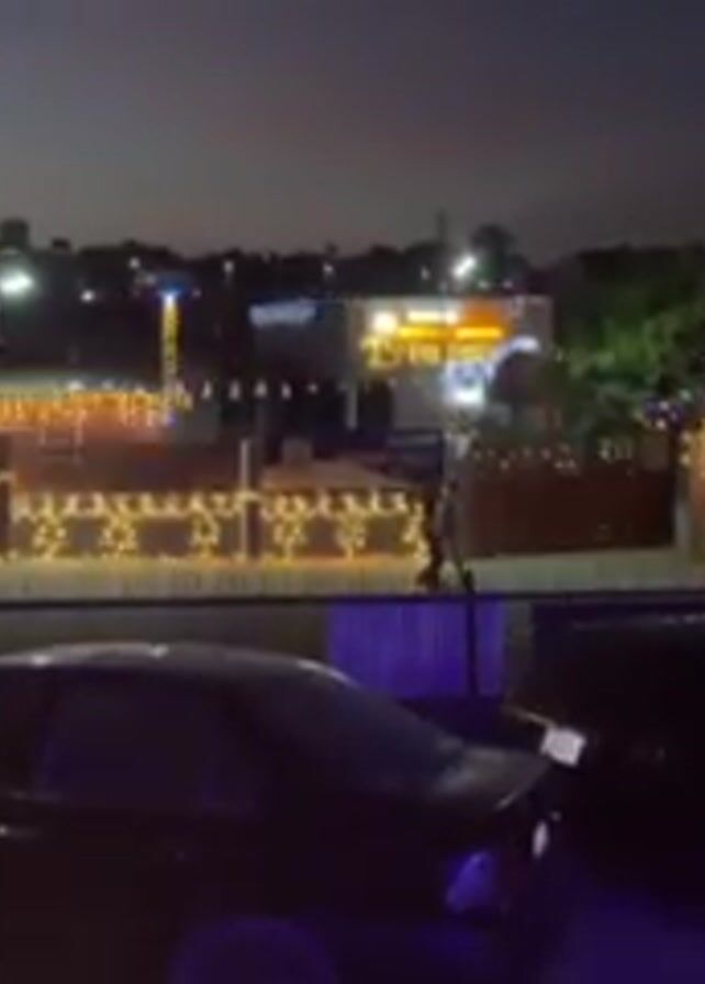 At night, two dark-colored cars are parked in front of a building that is decorated with many lights. The building seems to be hosting an event or celebration, with strings of lights outlining its structure and design. The background consists of a dark sky with hints of twilight and other structures illuminated in the distance. A lone person is walking across the courtyard of the lighted building. There are some street lights visible in the background.