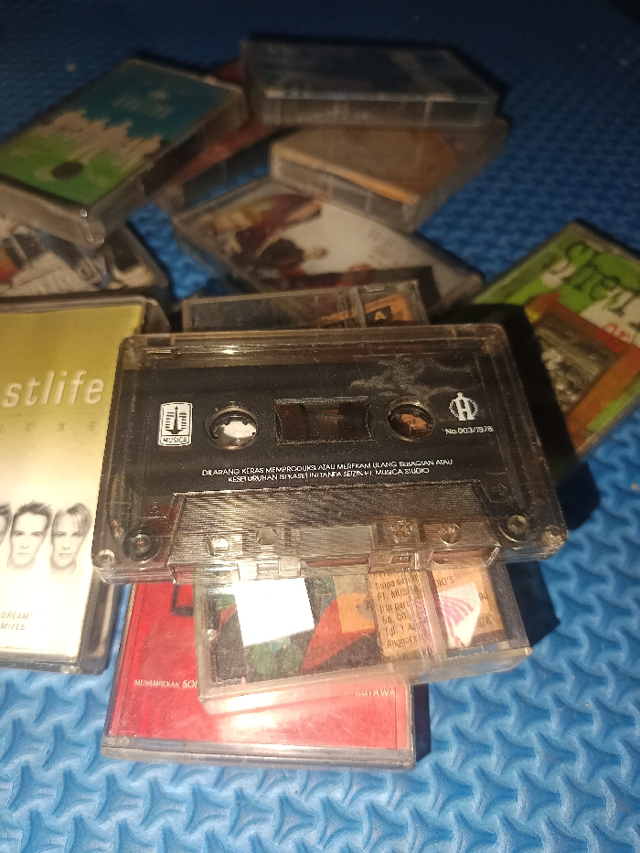 The image displays a collection of approximately fifteen audio cassette tapes and their clear plastic cases, scattered and partially stacked on a blue, textured surface