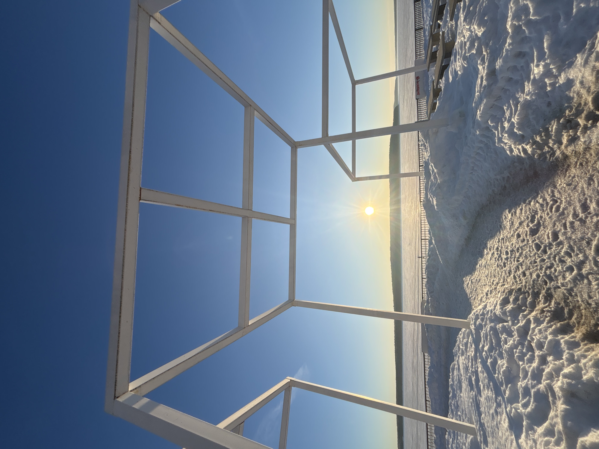 This image depicts a winter landscape at the waterfront in Chaikovsky, Russia, during what appears to be either sunrise or sunset. The foreground is composed of uneven, textured snow, showing compressed footprints forming a clear path leading towards the water. Several large, white, open-sided cubic or rectilinear architectural frames are prominently positioned in the snow. In the midground, a dark metal fence or railing runs horizontally, separating the snow-covered ground from the frozen body of water. Behind the fence, partially obscured by snow, are multiple stone or concrete benches. A small red sign with white lettering is attached to the fence. A solitary, small human figure is visible walking on the frozen surface beyond the fence, to the right of the image center. The background consists of a vast, flat expanse of frozen water, likely the Votkinsk Reservoir, extending to a distant, dark treeline or landmass on the horizon. The sky above is clear and deep blue, with the sun visible as a bright, radiating orb low on the horizon, centered in the frame.