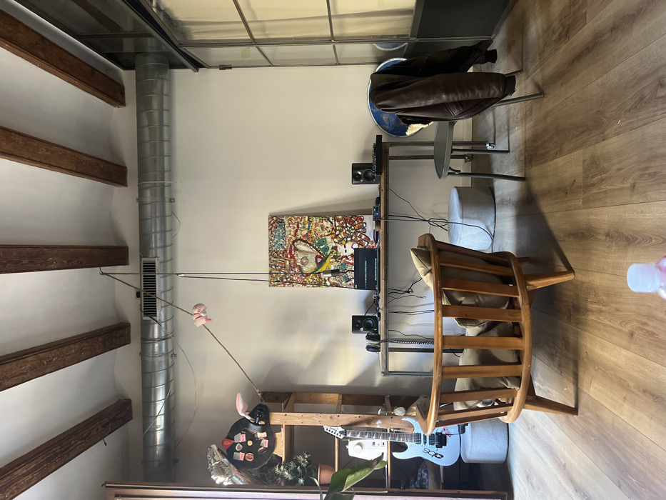 The scene depicts the interior of a residential or studio space in Barcelona, Spain, characterized by an industrial-chic aesthetic with exposed utilities. The ceiling features multiple parallel wooden beams and a large, horizontally running metallic spiral HVAC duct with a vent. The walls are light-colored. The floor is covered with light brown wooden planks. In the center-background, a long, narrow table with a metal frame and a wooden top functions as a music production workstation. It holds an open laptop, two black studio monitor speakers, a pair of black headphones, and various connecting cables. Behind the table, a vibrant, multi-colored abstract painting featuring a stylized face or heart is mounted on the wall. To the left of the workstation, a multi-tiered wooden shelving unit is visible. On its top shelf rests a dark, circular object adorned with small patches or stickers and white bunny ears, next to a silver, reflective object. The middle shelf holds a light blue electric guitar and a white sewing machine. A small potted plant with green foliage is positioned near the shelving unit. In the mid-ground, a light-colored wooden lounge chair with two beige cushions faces partially towards the viewer. To its right, a dark brown leather jacket is draped over the back of a dark grey metal chair with casters. Two round, grey fabric poufs are situated on the floor: one near the lounge chair and another near the workstation. A thin rope descends from the ceiling, attaching to the HVAC duct and extending towards the left. A small, light pink plush toy, resembling a pig, hangs from this rope. Another thin black cable descends near the painting. The immediate foreground shows the blurry top of a translucent bottle with a pink cap. No individuals are present in the scene.