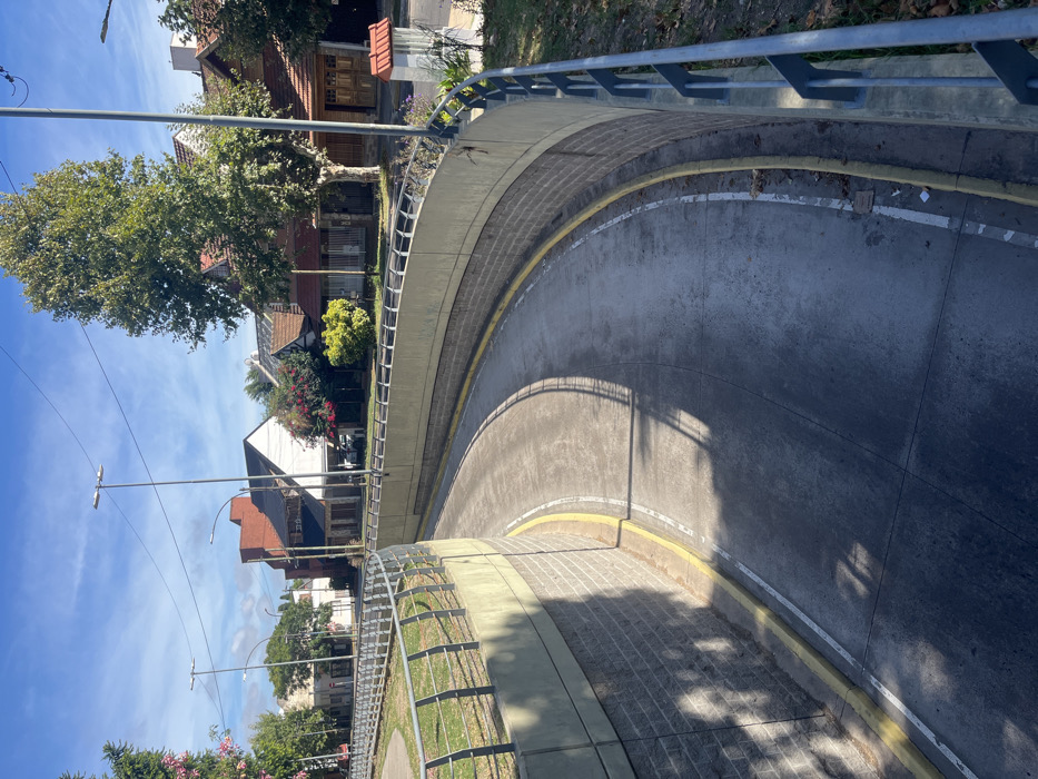 A curved road runs between a sidewalk and a retaining wall with a metal railing