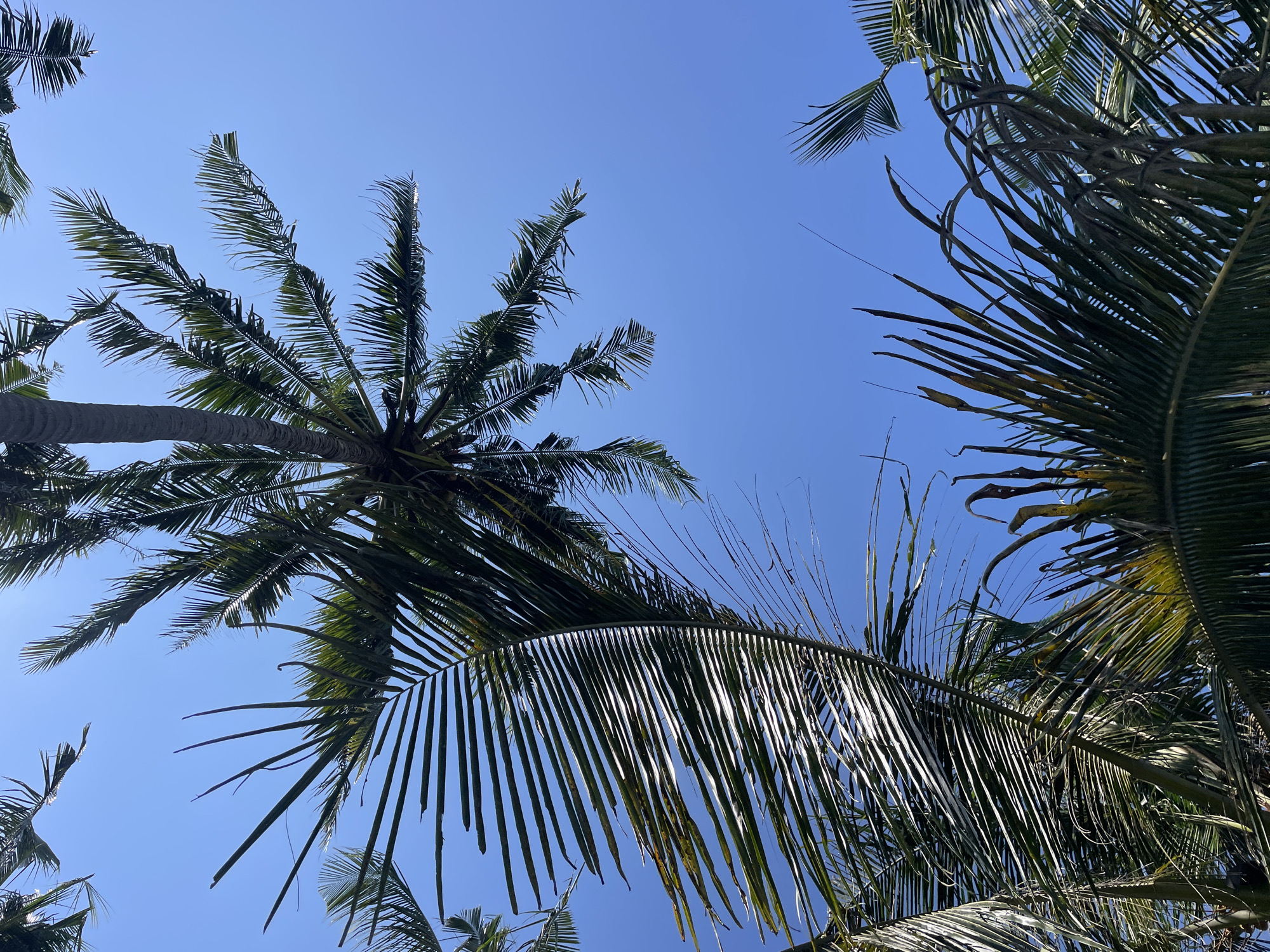 view of palm trees against a clear, bright blue sky