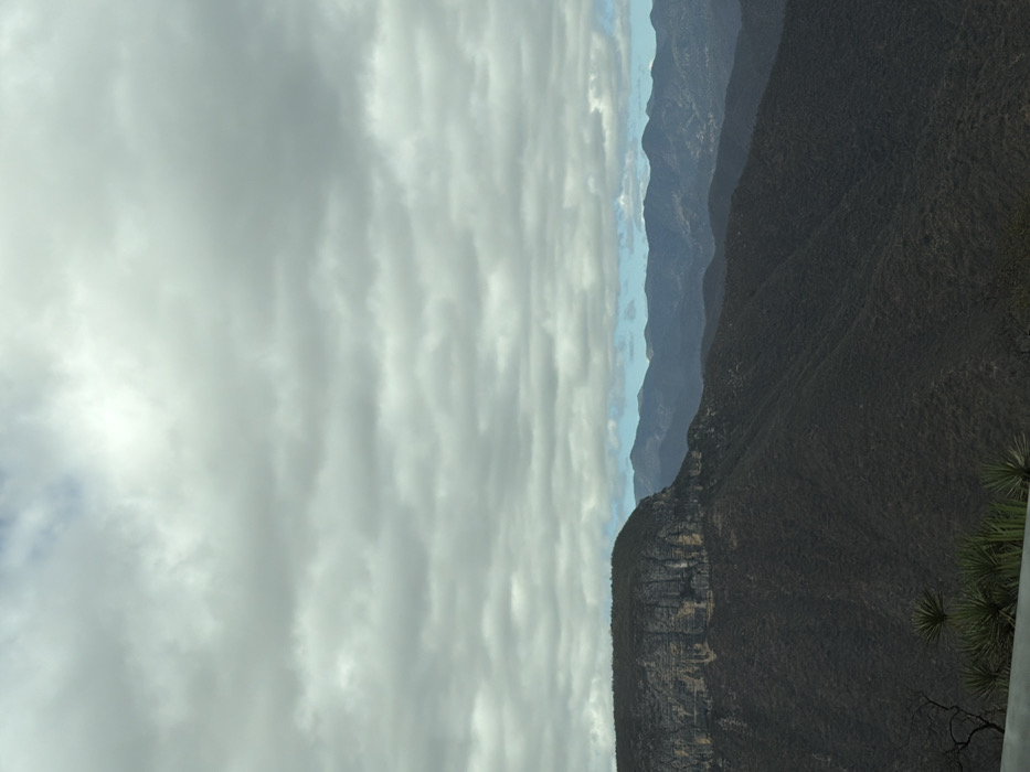 Layers of mountains stretch under a cloudy sky. Close up, a steep cliff face transitions into densely covered terrain on the right. Further away, receding mountain ranges fade into the horizon with a hint of blue sky. The sky is filled with textured gray clouds. A sparse yucca-like plant is visible in the lower right.