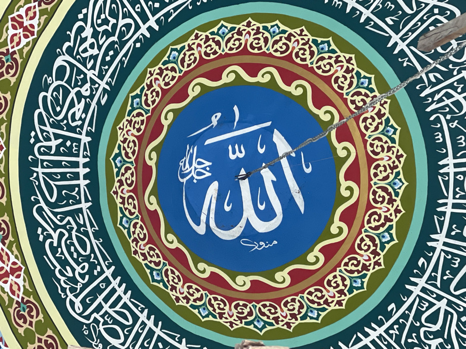 The image displays a vibrant, intricately decorated interior dome or ceiling, located in Kumbang, Indonesia. The central element is a multi-ringed circular design featuring Islamic calligraphy and patterns. The innermost circle, a bright blue field, contains prominent white Arabic script spelling "Allah," with smaller white script "Muhammad" positioned below it. Surrounding this blue center are concentric rings: a thin red band, a cream-colored band detailed with red and light blue ornate geometric and floral patterns, a dark green band, a wider teal band, and a maroon band. The outermost visible section is a broad dark green ring extensively adorned with white Arabic calligraphy. A thin, silver-colored metal chain descends diagonally from the upper central area, passing over the blue circle and subsequent rings, extending towards the lower right. Portions of two unfinished wooden support beams are visible at the bottom left and bottom right corners of the frame, partially obscuring the decorated surface. No people are visible.