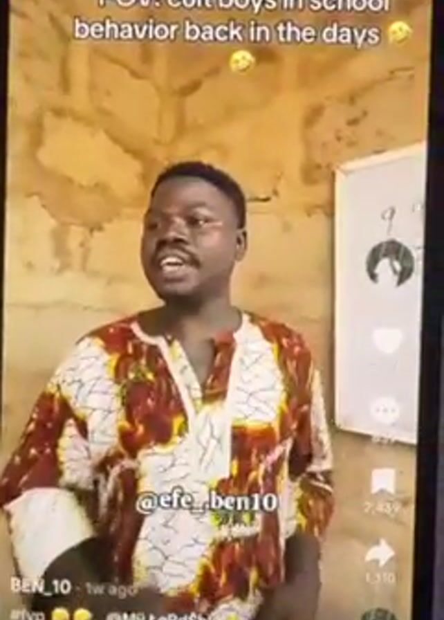 TikTok post with the text "POV: cult boys in school behavior back in the days." A man in a patterned shirt, apparently acting as a teacher, is asking a question to the camera. The video cuts to a young woman with a backpack who responds to the question. Behind her, there are two more young men in school uniforms. The video then cuts back to the "teacher". There is a whiteboard visible in the background with numbers written on it. The creator's handle on TikTok is @efe_ben10.