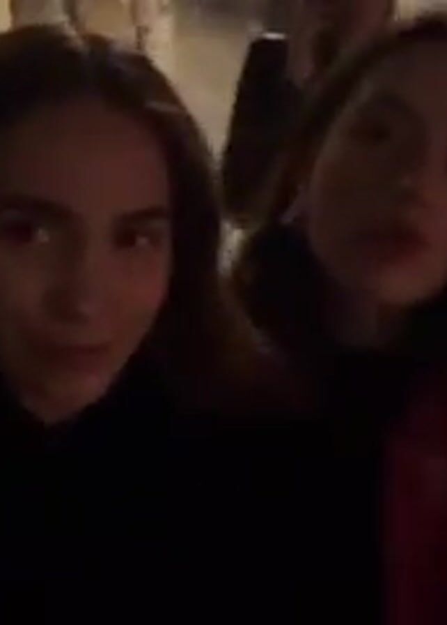 Two young women are walking outside at night, recording a video on a mobile device. The woman on the left is wearing a black hooded sweatshirt. The woman on the right is wearing a red jacket. They both have long brown hair. Several other people are walking behind them, including one wearing a baseball cap. There are buildings on either side of the sidewalk and street lights illuminating the area.