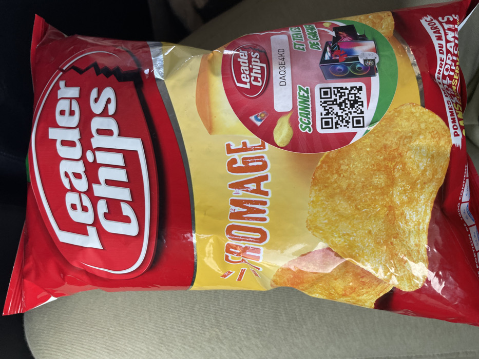 close-up view of a sealed red and yellow bag of "Leader Chips" potato crisps. The red top section displays "Leader Chips" in white, while the central yellow section features "FROMAGE" (Cheese) in orange text. Golden-brown potato chips are illustrated across the lower yellow portion of the bag. A circular red sticker on the right side contains a "Leader Chips" logo, a text field with the code "DAQ3E4KD," a QR code labeled "SCANNEZ" (Scan), and the phrase "ET TENTEZ DE GAGNER" (And try to win), accompanied by illustrations of a gaming PC tower, a laptop, a smartwatch, and a smartphone as prizes. Partially visible text at the bottom states "POMMES DE TERRE DU MAROC" (Potatoes from Morocco) and "SANS CONSERVATEURS" (Without preservatives). The background consists of a blurred, light-colored fabric, consistent with upholstery or clothing. The scene is located in Sidi El Makhfi, Morocco.