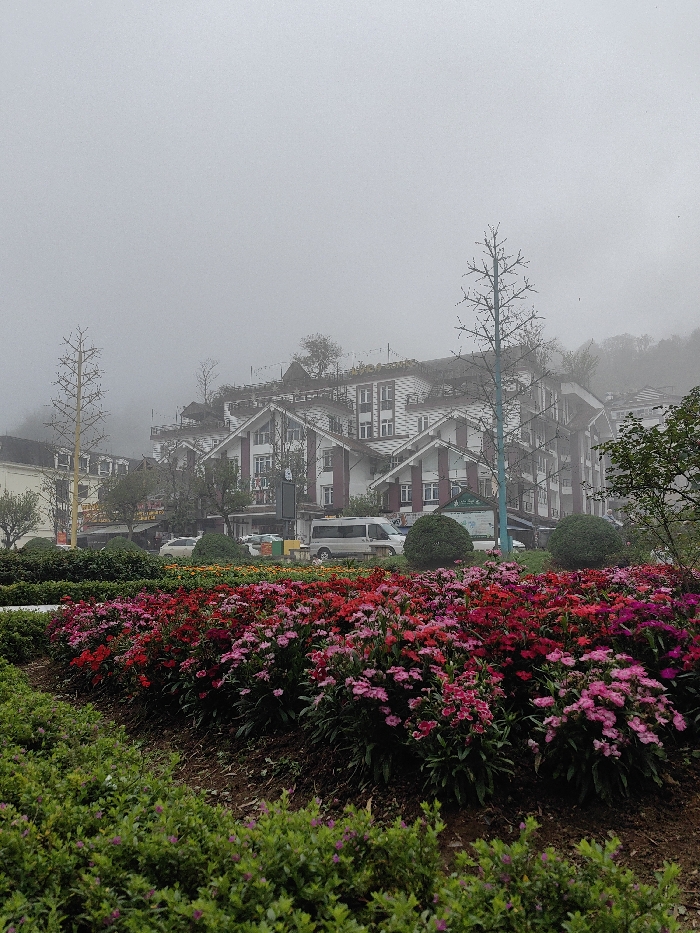 The image depicts a foggy urban landscape in Sa Pa, Vietnam. In the foreground, vibrant flowerbeds filled with red and pink blossoms occupy the lower half of the frame, bordered by green shrubs. The midground features a street with several parked vehicles, including a prominent white passenger van, and manicured green spherical bushes. Two tall, bare trees with thin branches are visible; one on the left has a yellowish trunk, and another on the right has a blue-grey trunk. In the background, a series of multi-story buildings with white facades, dark roofs, and prominent gables, characteristic of European chalet architecture, are situated on a hillside, partially obscured by dense fog that dominates the upper portion of the sky. No individuals are clearly discernible.