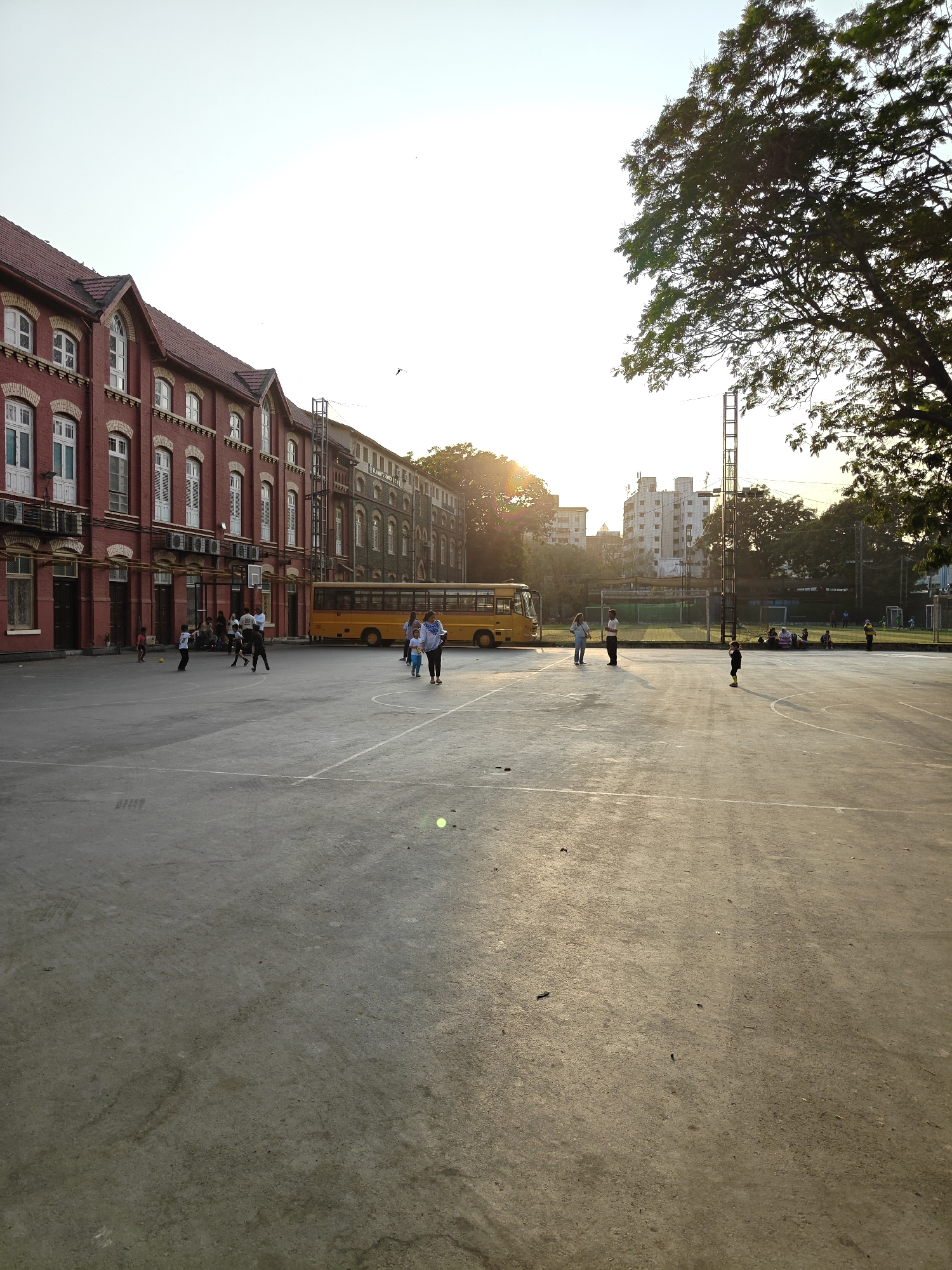 schoolyard in Mumbai, India, bathed in late afternoon sunlight. The foreground is dominated by a concrete playground with worn white line markings. In the background, children play around a yellow school bus, which is parked in front of a large brick building with multiple stories and arched windows. A tree is on the right side and obscures some distant apartment buildings. In the far background, people are seated next to a soccer field. The sky is bright with a golden sunlight.