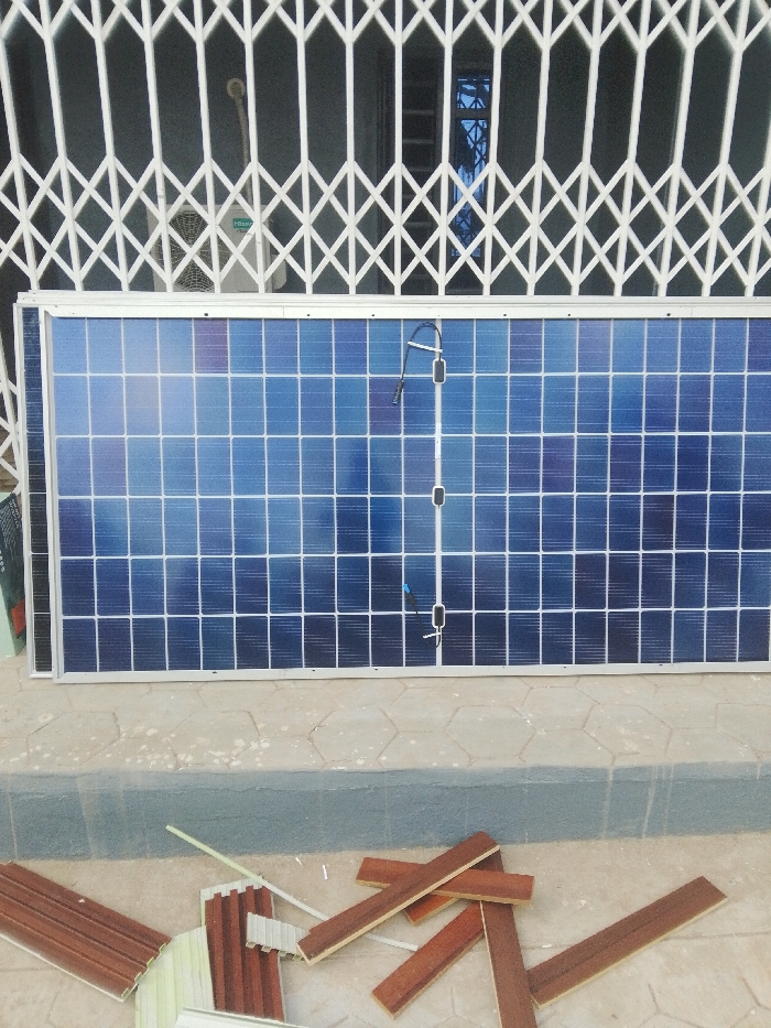 large, rectangular blue photovoltaic solar panel, approximately 1.5 meters by 1 meter, with a silver frame, standing upright on a paved surface in Offatedo, Nigeria. The panel's surface consists of numerous individual blue solar cells arranged in a grid, exhibiting variations in blue tone. Black electrical wiring with two inline connectors extends from the right side of the panel. Behind the solar panel, a white, diamond-patterned retractable security grille is fully extended across a building opening. A white outdoor air conditioning unit, bearing a visible "Hisense" logo, is partially obscured behind the grille in the upper-left background. A distant bluish reflection, possibly sky, is visible through the grille's opening. The foreground features a light grey hexagonal paver surface directly beneath the solar panel. Below this, on a darker grey ground level, multiple scattered pieces of reddish-brown wooden or wood-composite trim and several lighter-colored, possibly white or light green, plastic or PVC trim pieces are present. No individuals or active interactions are visible in the scene.