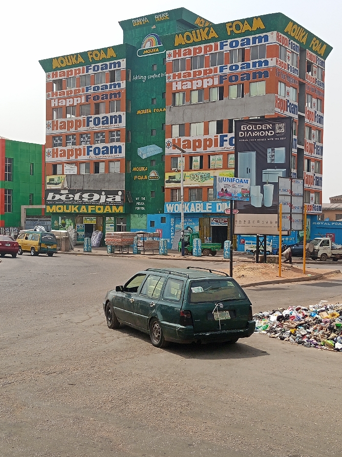 This image depicts a commercial street scene in Sardauna, Nigeria, centered around a prominent, multi-story building