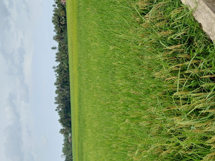 A lush green paddy field stretches under a cloudy sky. A line of palm trees separates the field from the sky. The rice plants are heavy with grain, some starting to turn golden. The grass grows high, obscuring the exact border of the field. A concrete structure runs alongside, suggesting a path or boundary.