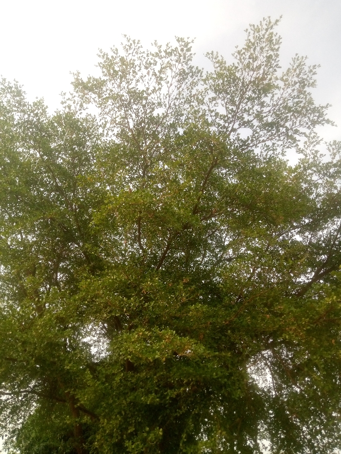 A dense canopy of a deciduous tree, characterized by numerous small, ovate green leaves, fills the majority of the frame