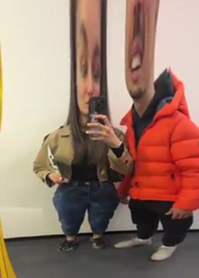A woman and a man stand in front of a warped mirror, and they are reflected within. The woman holds a phone and is taking a selfie. The man has squatted down and is smiling. The woman wears a tan jacket, a black shirt, blue jeans, and sandals. The man wears an orange puffer jacket, black pants, and white sneakers. They both have elongated, distorted faces in the reflection. The walls are white, and the floor is gray. A yellow section of the mirror is visible in the bottom left.