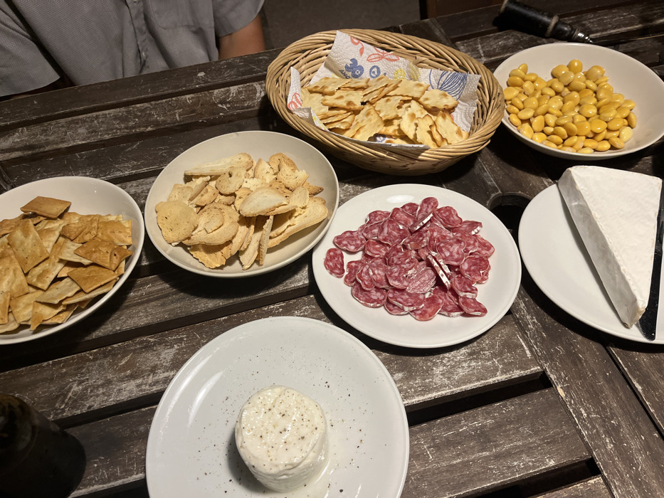 A top-down view depicts a dark brown, slatted wooden table set with various food items in Ponte de Lima, Portugal. On the table, from upper-left, a round white plate holds a disc of white cheese or spread topped with black pepper. Adjacent to it, an oval white bowl contains flat, rectangular crackers. To its right, another oval white bowl is filled with assorted toasted bread pieces. In the mid-right, a woven wicker basket, lined with a patterned paper napkin, holds additional flat crackers. Below this, an oval white bowl is filled with yellow lupini beans. At the bottom-left, an oval white plate presents a wedge of soft, white-rinded cheese with a small knife resting on it. Centrally located on the left side, an oval white plate contains numerous thin slices of red cured sausage. A dark-handled bottle opener is partially visible on the bottom-right. The upper-right corner shows a segment of a person's arm and light grey clothing, indicating an individual seated at the table.