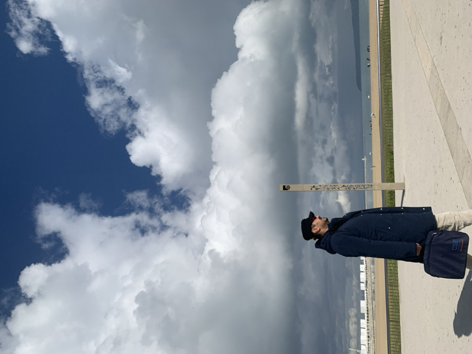 - "An adult male is observed walking rightward on a concrete promenade under a mixed sky of bright blue patches and large, dramatic white and dark grey clouds" by FM-Gn7EC2, licensed under CC BY 4.0