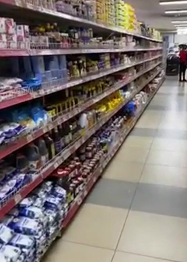 interior of a supermarket aisle with high shelves stocked with various grocery items. The shelves display a wide array of products, including jars, bottles, packaged goods, and stacked containers. The shelves are generally well-organized and fully stocked. The aisle itself is clean with tiled flooring. There are a few people, who appear to be customers, visible in the background of the video. The lighting in the supermarket is bright and uniform.