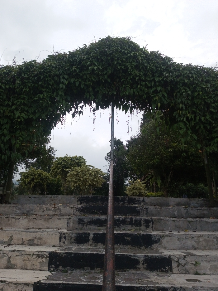 The image depicts an outdoor staircase leading upwards, framed by a dense, leaf-covered archway, under an overcast sky in an unknown city in Vietnam. In the foreground, a series of at least five concrete steps ascend, each featuring an alternating pattern of faded black and light grey/concrete on their risers and treads. The concrete is visibly worn, with cracks and peeling surfaces. A single, dark, rusted metal pole or pipe extends vertically from the bottom center of the frame, partially obscuring the steps and the view. Above the steps, a large archway, entirely enveloped in dark green foliage, forms a tunnel-like structure. Loose tendrils and vines hang from the underside of the leafy arch. Through the opening of the archway, additional trees and bushes with varied green and lighter-colored foliage are visible, suggesting a continuation of the natural environment. The sky above is uniformly grey and cloudy, indicating an overcast day. No individuals or specific actions are observed.